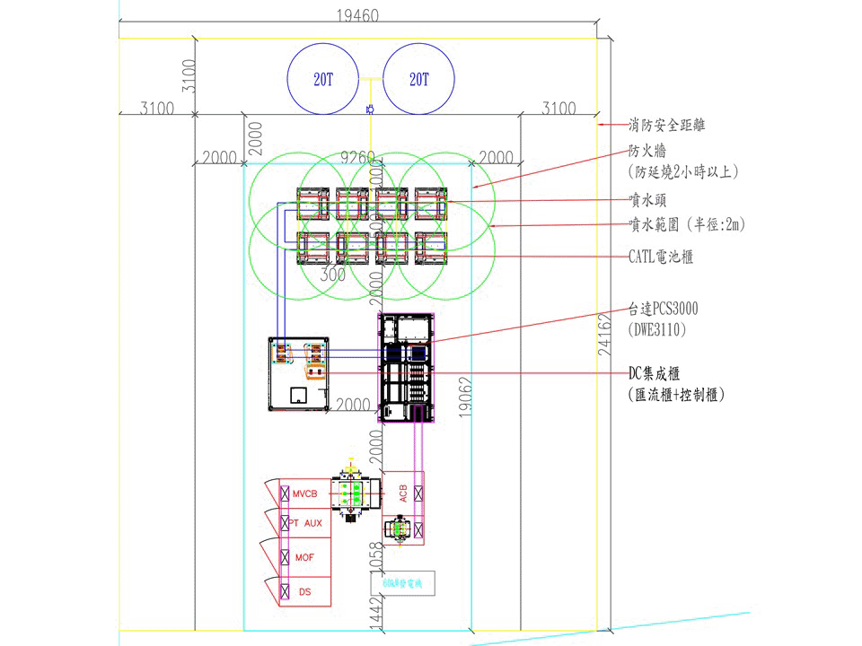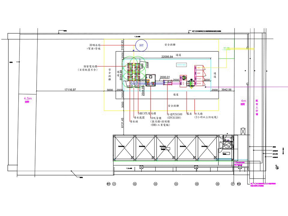 儲能系統須建置電力設備,使配電盤做為電力分配的設備並為儲能系統與電網之電力銜接,在高壓配電盤箱體內,提供儲能案場配電場所,穩定發電。